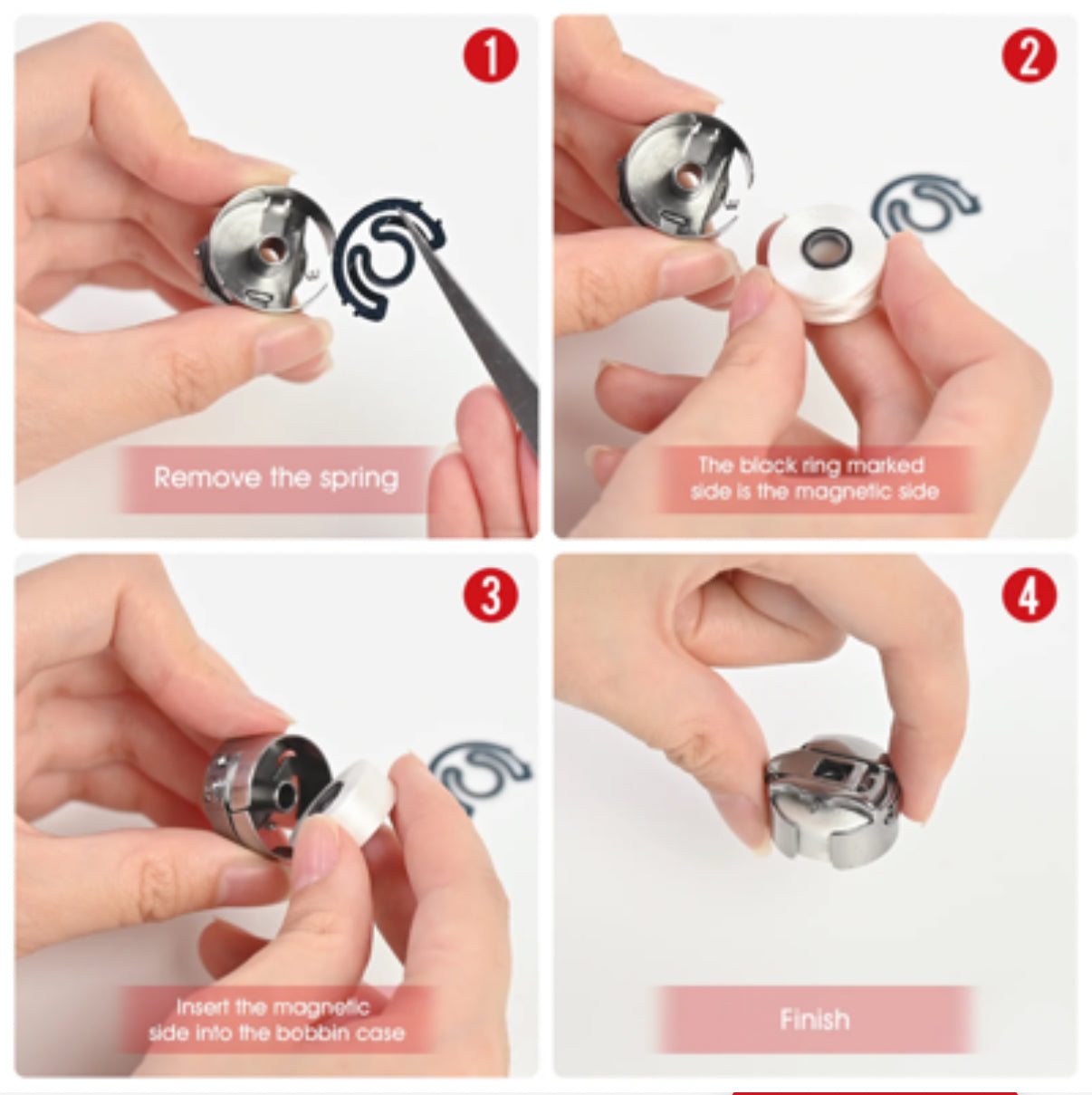- Magnetic Core Bobbins: The magnetic core holds the bobbin securely in the metal bobbin case, maintaining continuous tension throughout the life of the bobbin. Please remove the Anti-spin Spring from the bobbin case when use magnetic bobbin.